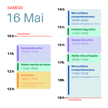 Le samedi de 10h00 à 12h00 (Balades éducatives) et de 14h00 à 19h00